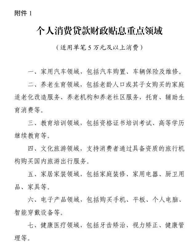 贴息范围包括单笔5万元以下消费,以及单笔5万元及以上的家用汽车、养老生育、教育培训、文化旅游、家居家装、电子产品、健康医疗等重点领域消费。