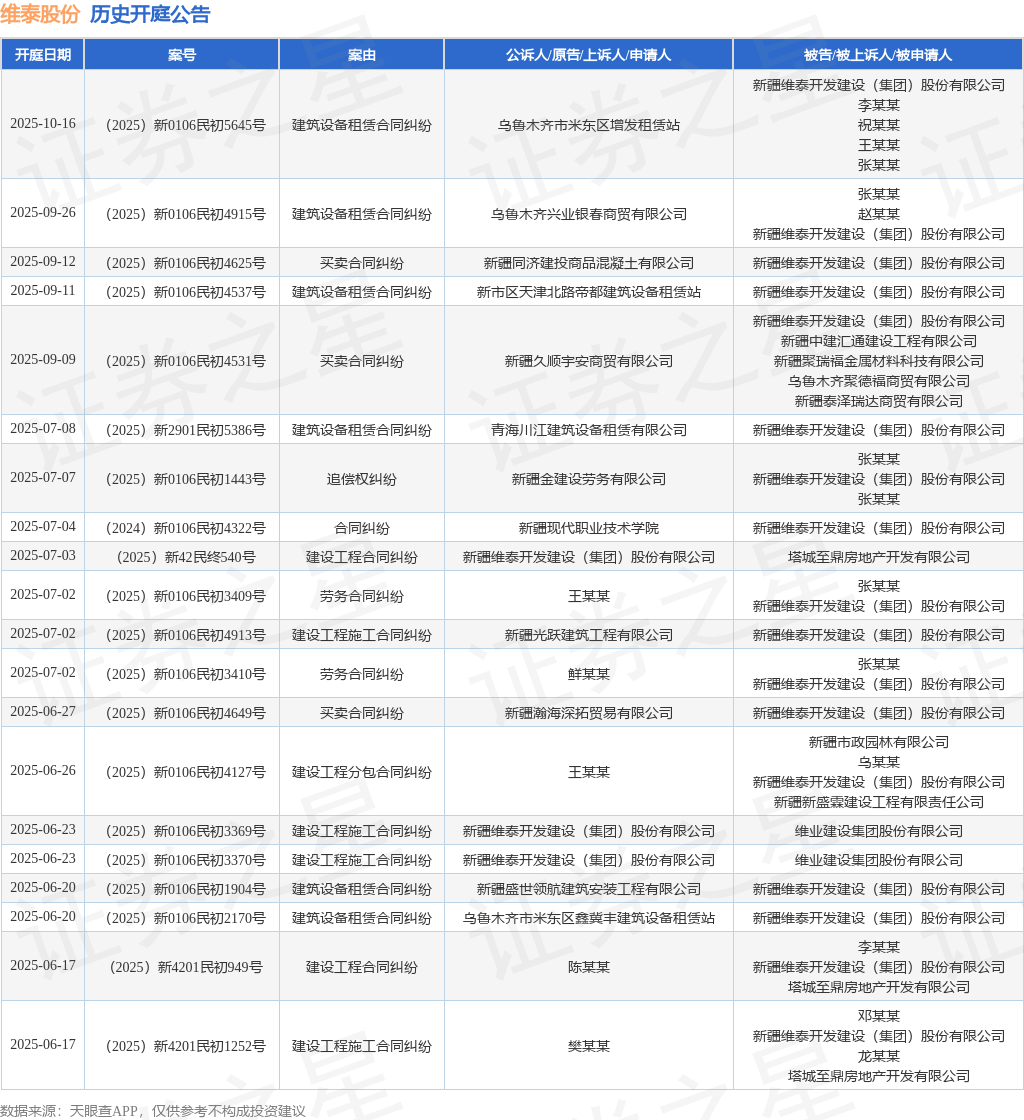 案号:(2025)新0106民初4127号审理法院:乌鲁木齐市头屯河区人民法院案由:建设工程分包合同纠纷当事人信息: 原告/上诉人:王某某 被告/被上诉人:新疆市政园林有限公司、乌某某、新疆维泰开发建设(集团)股份有限公司、新疆新盛霖建设工程有限责任公司开庭日期:2025年6月26日根据统计,近一年内以新疆维泰开发建设(集团)股份有限公司为当事人的历史开庭公告有201则,其中案由为“买卖合同纠纷”的公告以64则居首,其次为“建设工程施工合同纠纷”有35则,“劳务合同纠纷”有26则。历史开庭公告(前20条)如下: